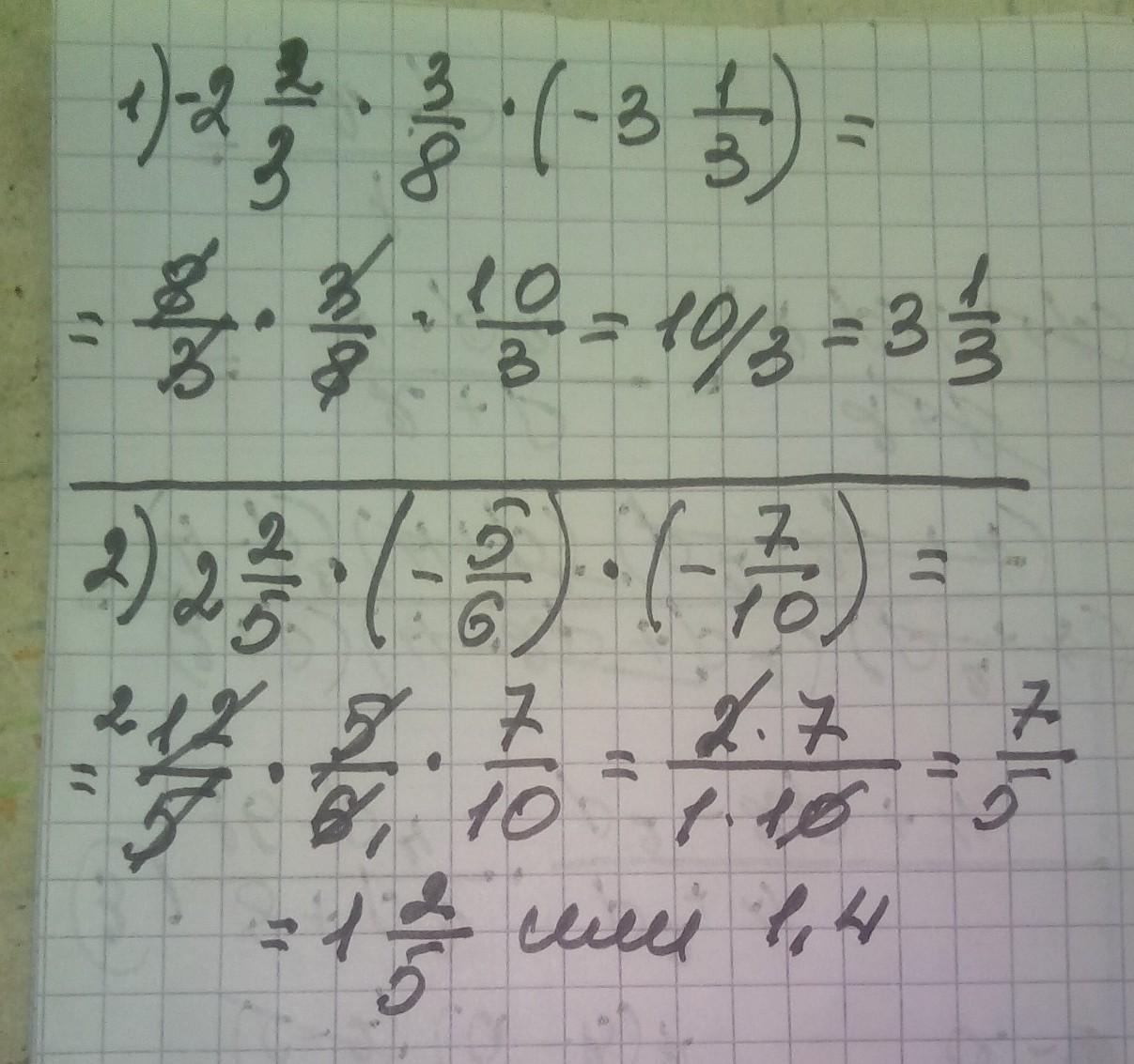 2) 2 2/5×(-5/6)×(-7/10) → 12/5×(-5/6)×(-7/10) → 12/5×5/6×7/10 → 12×1/6×7/10 → 2×7/10 → 7/5