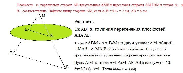 Плоскость α параллельна стороне АВ треугольника AMB и пересекает стороны AM i BM в точках А₁ и В₁ соответственно. Найдите длину стороны AM, если A₁B₁=АА₁ = 2 см, AB = 6 см.