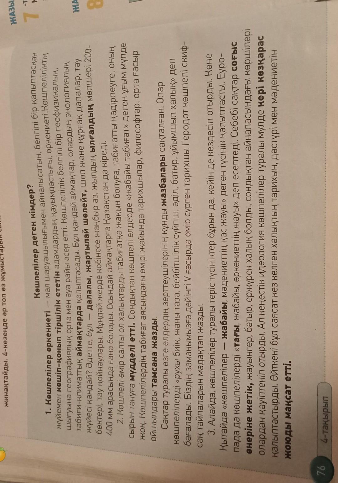 кочевников называют " народом высоким духом, чистым душой, миролюбивым, справедливым, героическим, сплоченным