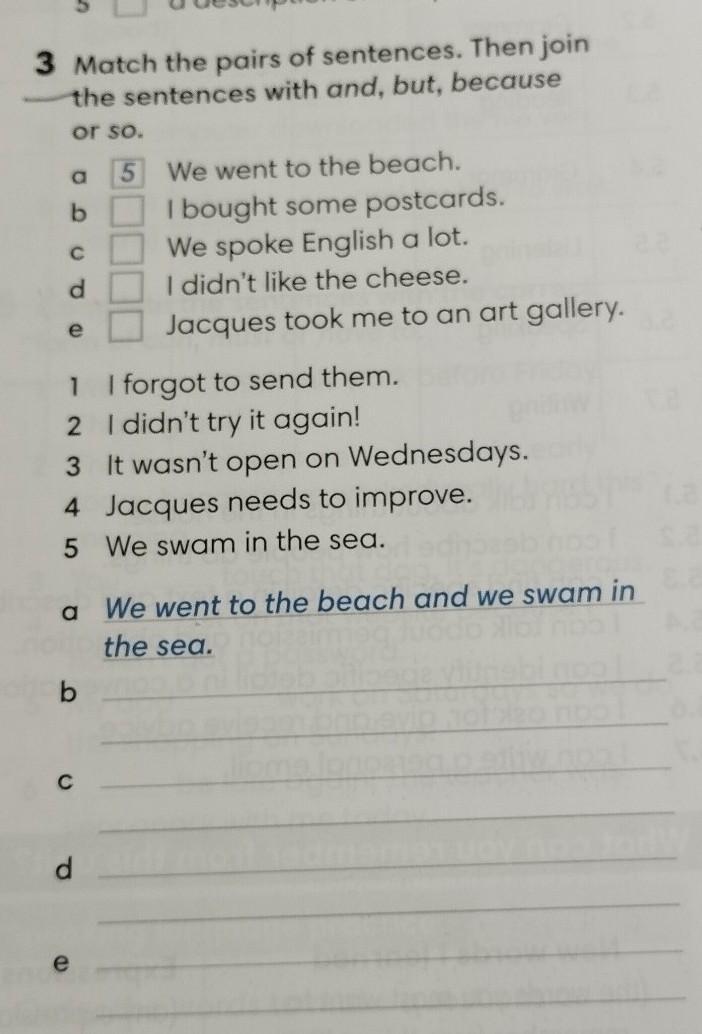 3 Match the pairs of sentences. Then join the sentences with and, but, because or so. 5 ODCO a b С d 1 2 I didn't try it again! 3 It wasn't open on Wednesdays. 4 Jacques needs to improve. 5 We swam in the sea. b a We went to the beach and we swam in the sea. of rob C We went to the beach. I bought some postcards. We spoke English a lot. I didn't like the cheese. Jacques took me to an art gallery. d forgot to send them. e