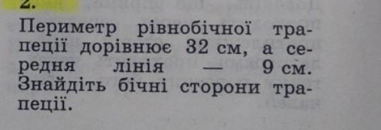 Периметр рівнобічної тра пеції дорівнює 32 см, а се редня лінія 9 см. Знайдіть бічні сторони тра пеції.