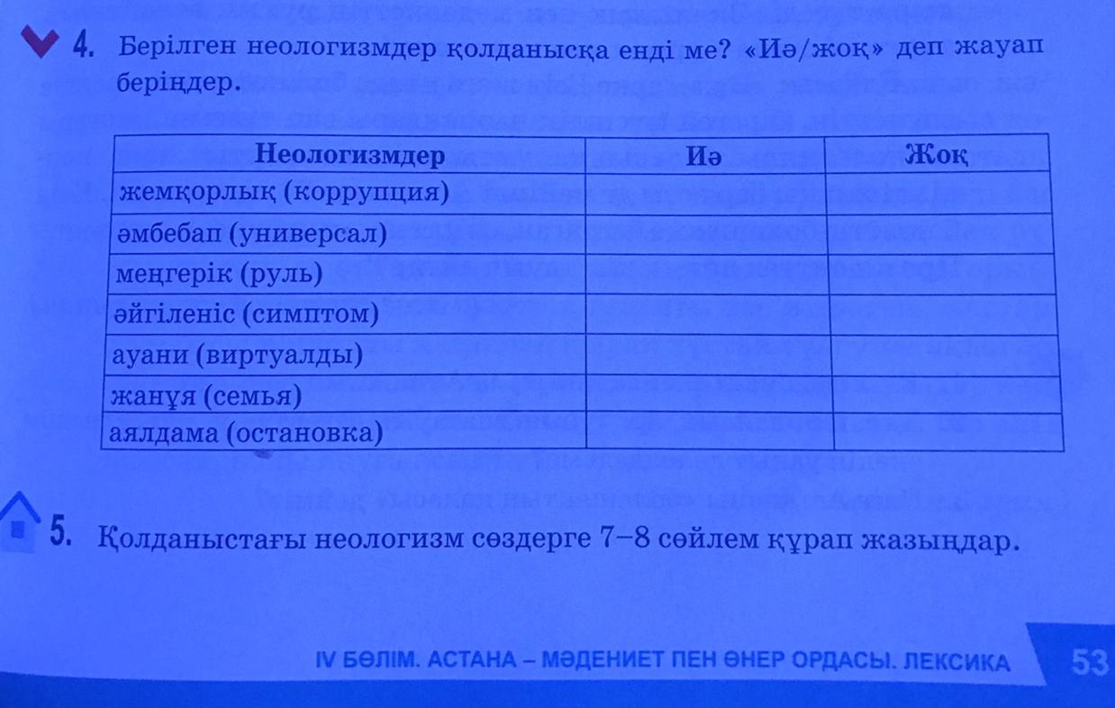 5. қолданыстағы неологизм сөздерге 7–8 сөйлем құрап жазыңдар.