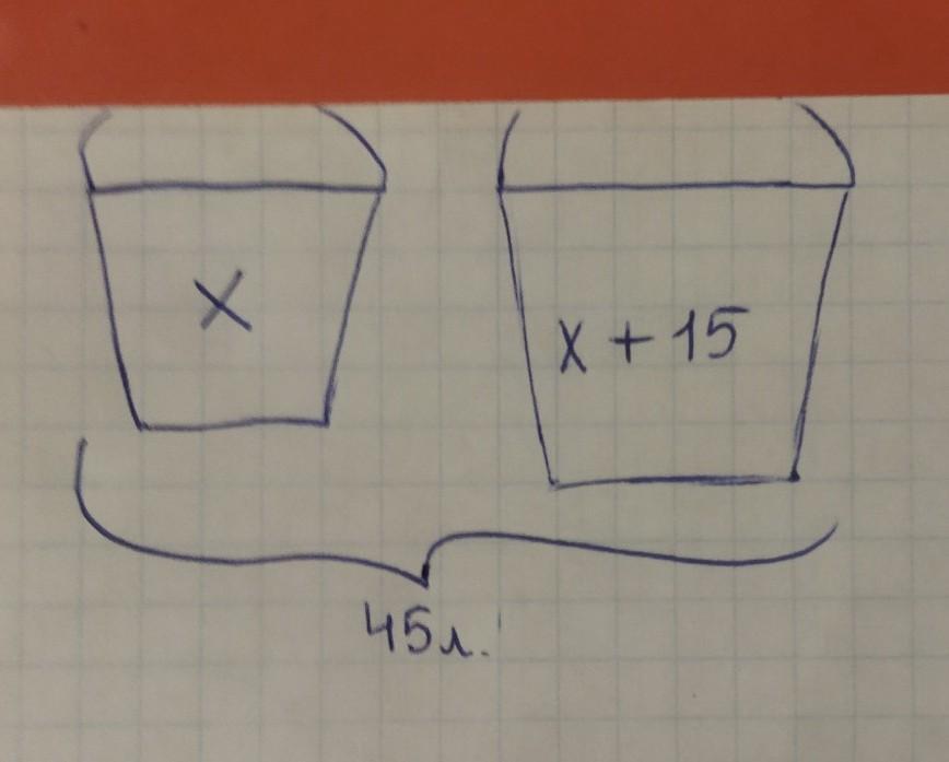 Скільки фарби у кожному з двох відер, якщо разом у двох відрах 45 л фарби, і в першому вiдрi на 15 л фарби менше, ніж у другому?