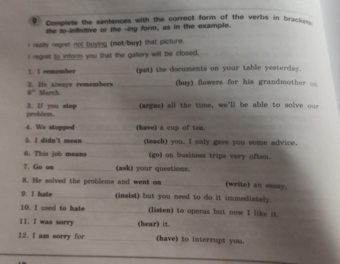 1)put, 2)buy, 3)argue 4)had 5)teaching 6)to go 7)asking 8)wrote 9)to insist 10)listening 11)hearing 12)have