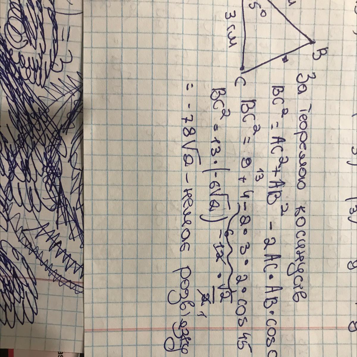 Побудуй трикутник ABC у якого <А=45°, АВ=2см, АС=3см