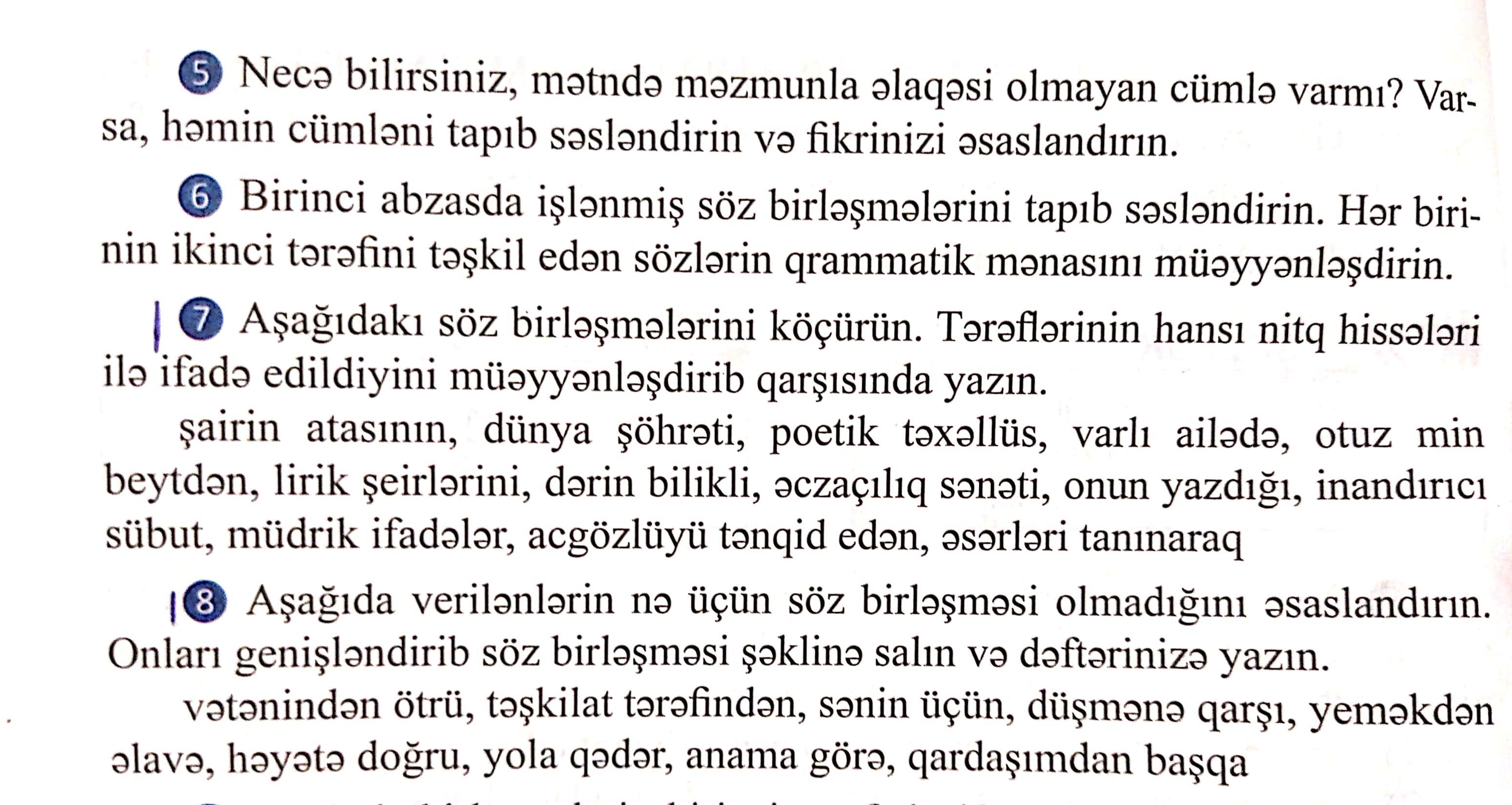 8. Aşağıda verilənlərin nə üçün söz birləşməsi olmadığını əsaslandırın. Onları genişləndirib söz birləşməsi şəklinə salın və dəftərinizə yazın.
