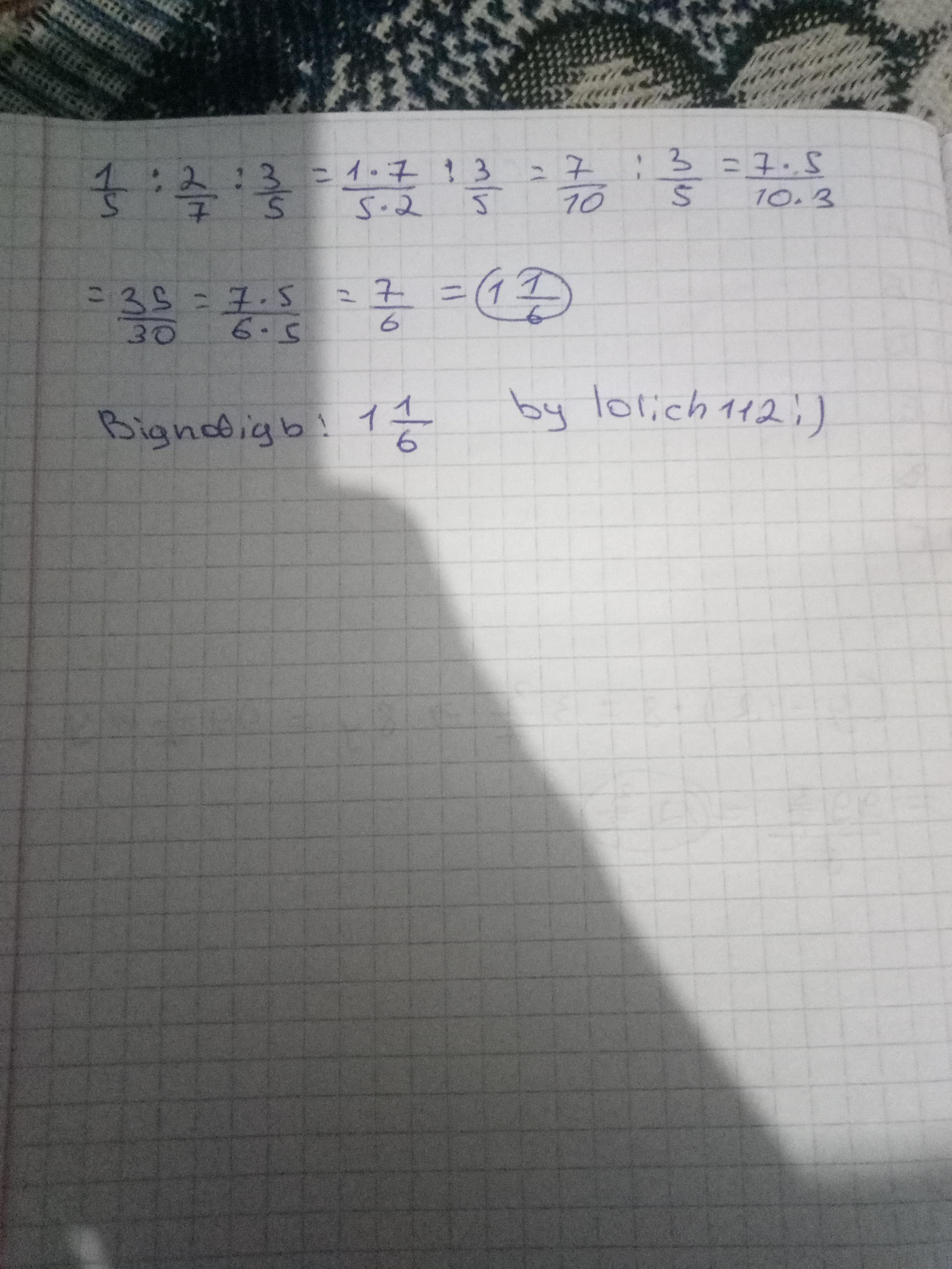 1/5 : 2/7 : 3/5 = 1/5 * 7/2 * 5/3 = (1/5 * 5/3) * 7/2 =
