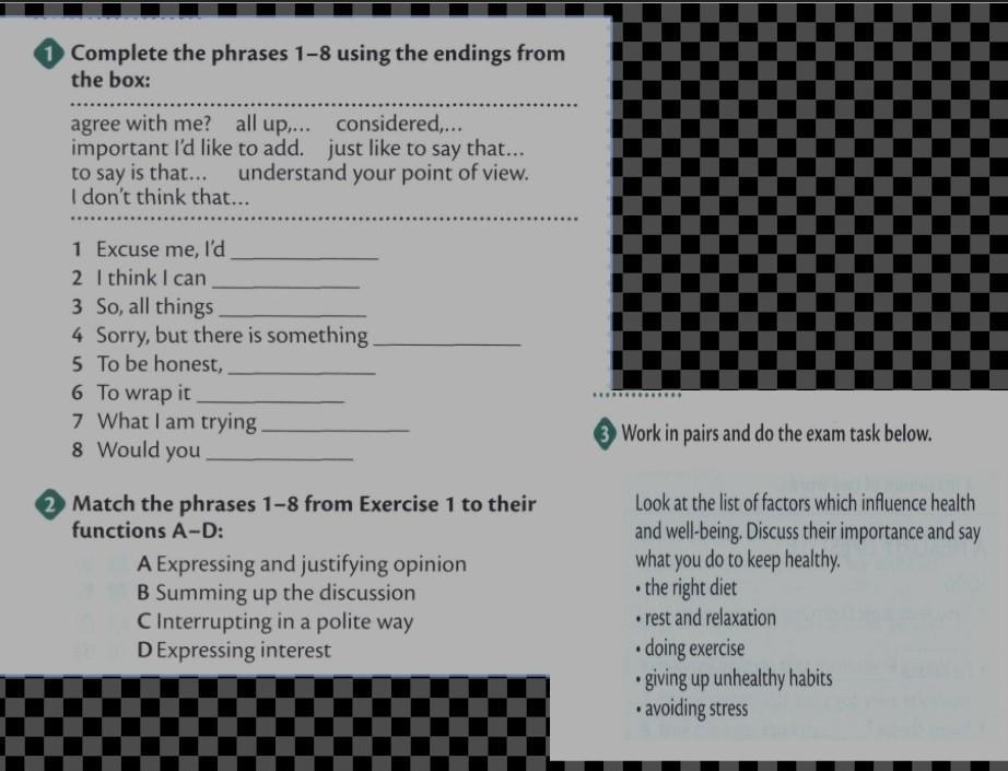 1 Complete the phrases 1-8 using the endings from the box: considered,... just like to say that... understand your point of view. agree with me? all up,... important I'd like to add. to say is that... I don't think that... 1 Excuse me, I'd 2 I think I can 3 So, all things 4 Sorry, but there is something. 5 To be honest, 6 To wrap it 7 What I am trying. 8 Would you. Match the phrases 1-8 from Exercise 1 to their functions A-D: A Expressing and justifying opinion B Summing up the discussion C Interrupting in a polite way D Expressing interest ************* Work in pairs and do the exam task below. Look at the list of factors which influence health and well-being. Discuss their importance and say what you do to keep healthy. the right diet • rest and relaxation . doing exercise giving up unhealthy habits avoiding stress