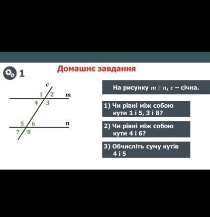 1. чи рівні між собою кути 1 і 5, 3 і 8? ( є, тому що вони відповідні)