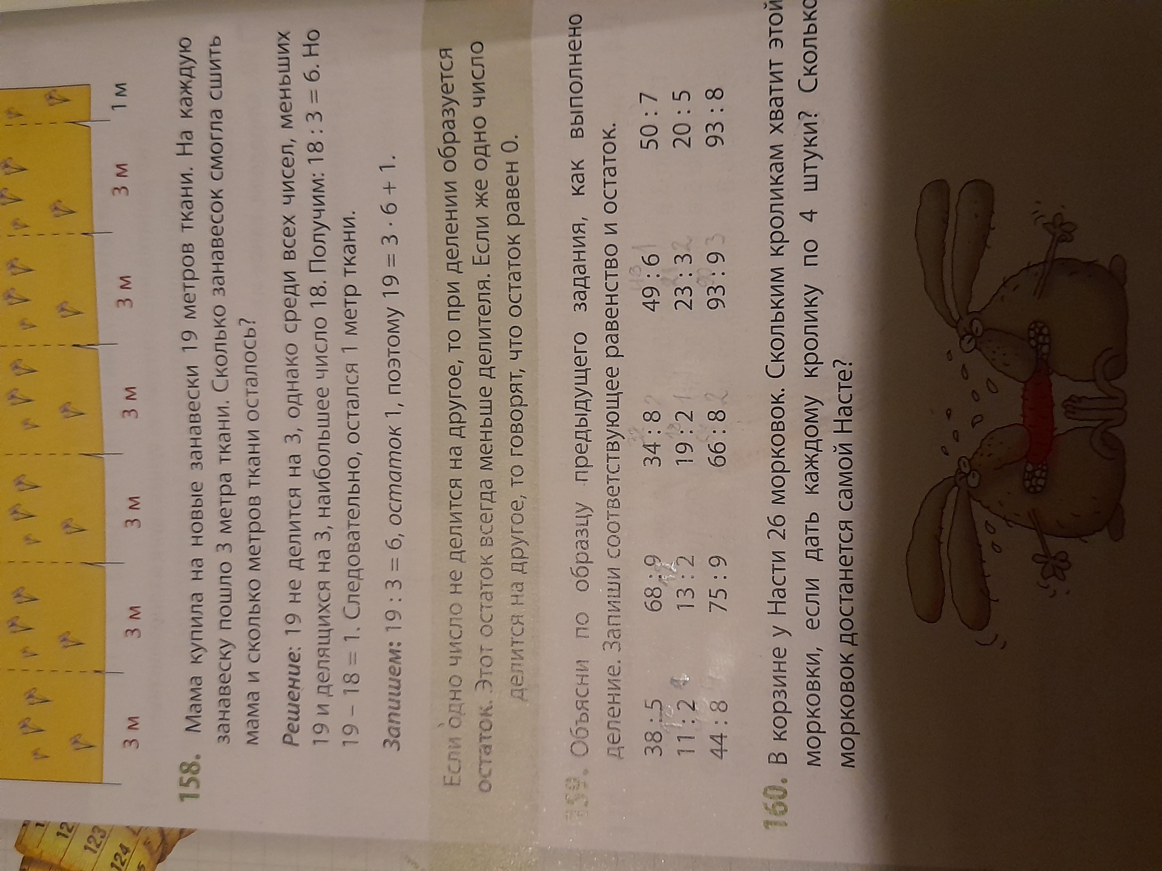 В корзине у Насти 26 морковок. Скольким кроликам хватит этой морковки, если дать каждому кролику по 4 штуки?Сколько морковок достанется самой Насте? Задание номер 160