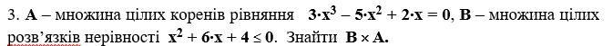 А – множина цілих коренів рівняння 3*х3 – 5*х2 + 2*х = 0, В – множина цілих розв’язків нерівності x2 + 6*х + 4 <= 0. Знайти В* А.
