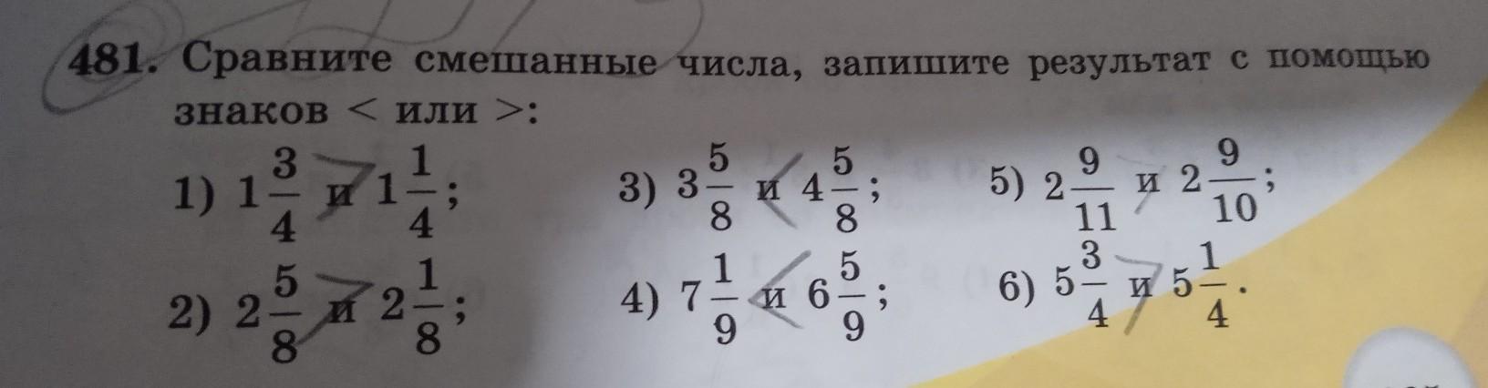 У 481. Сравните смешанные числа, запишите результат с помощью знаков < или >: 1)1 3/4 И 1 1/4. 2)2 5/8 И 2 1/8. 3) 3 5/8 И 4 5/8. 4)7 1/9 И 6 5/9. 5)2 9/11 И 2 9/10. 6)5 3/4 И 5 1/4.