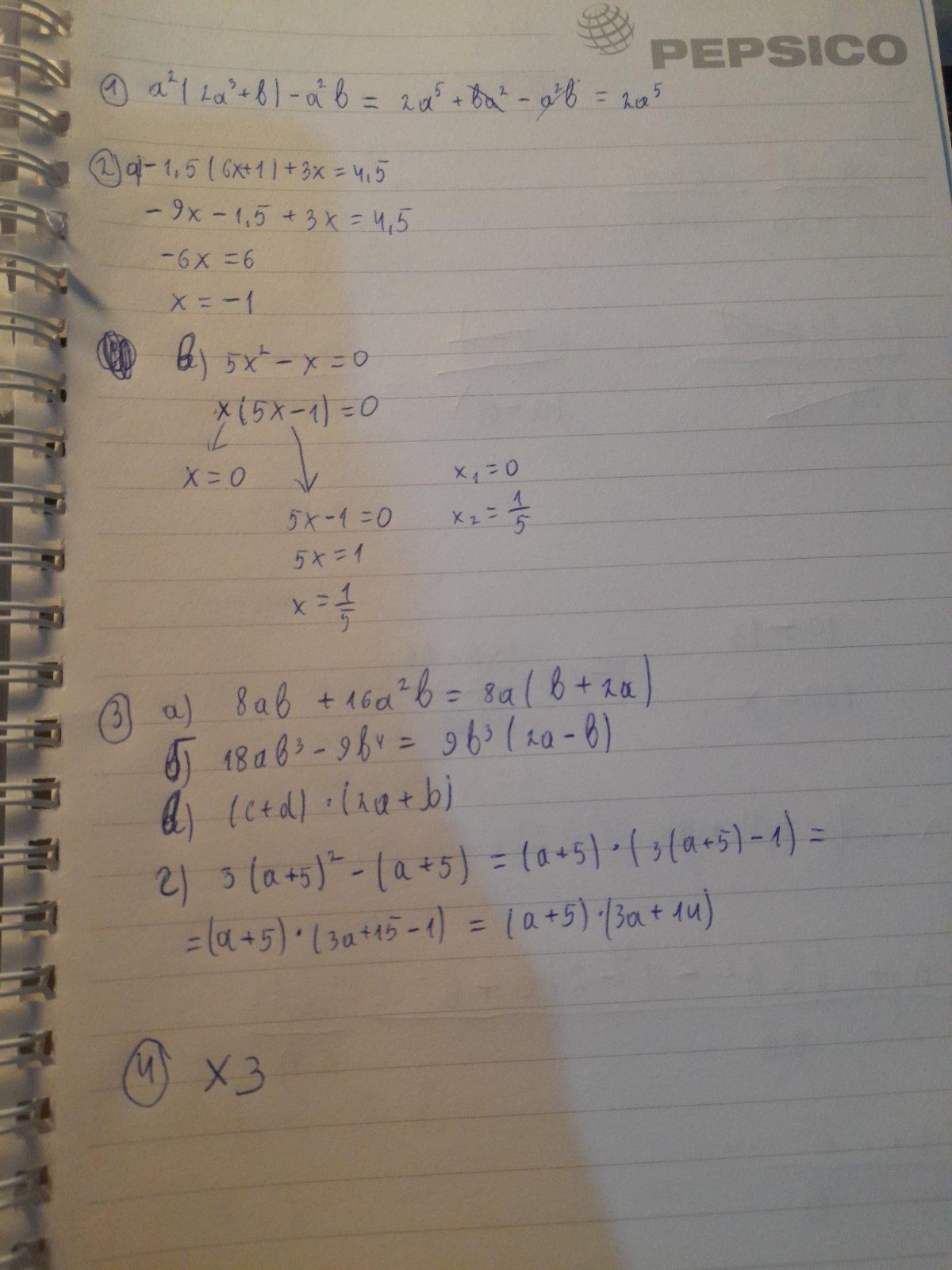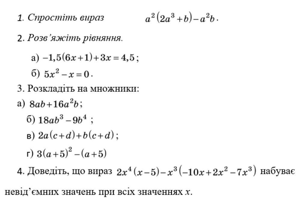 1. Спростіть вираз a² (2a³+b)-a²b. 2. Розв'яжіть рівняння. a) -1,5(6x+1)+3x=4,5; б) 5x²-x=0. 3. Розкладіть на множники: a) 8ab+16a2b; б) 18ab³ - 9b4; в) 2a(c+d)+b(c+d); г) 3(a+5)2-(a+5) 4. Доведіть, що вираз 2x⁴(x-5)-x³(-10x+2x2 -7x3) набуває невід'ємних значень при всіх значеннях х.