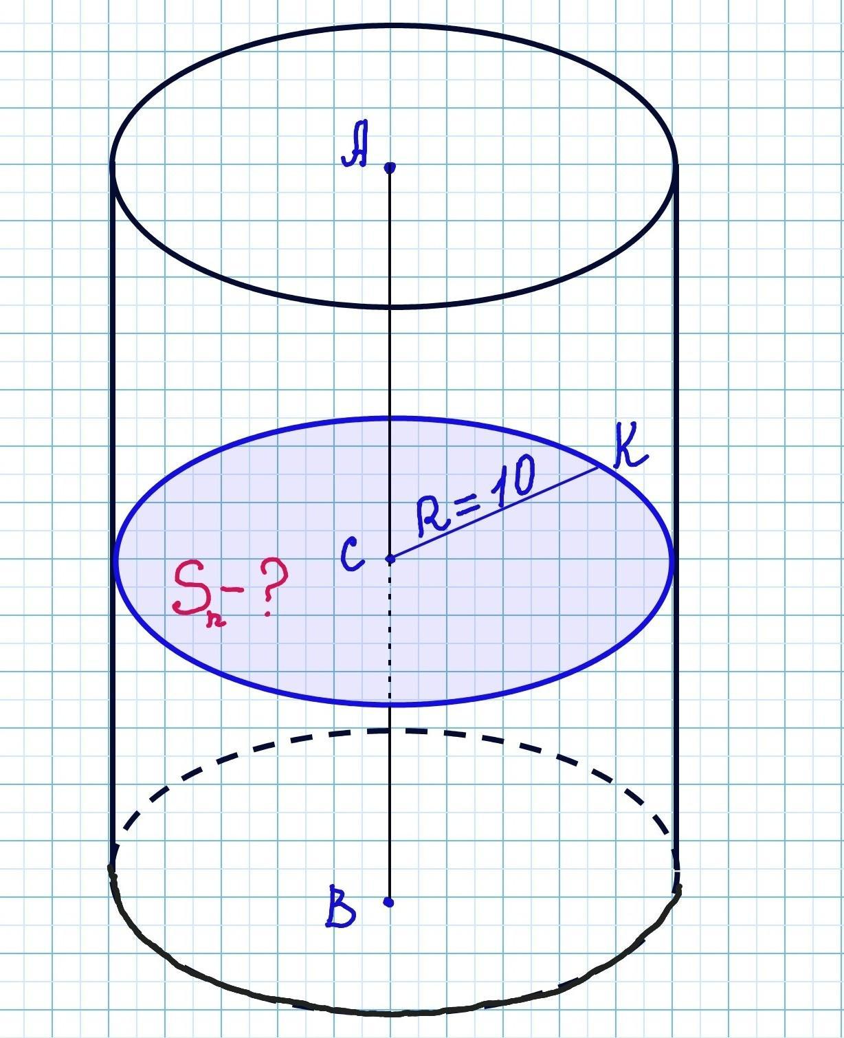 Маємо циліндр з радіусом R=10 см. Пряма AB - вісь циліндра. Точка С ∈ AB. Через точку С проведемо переріз площиною, яка є паралельною до площини основ.