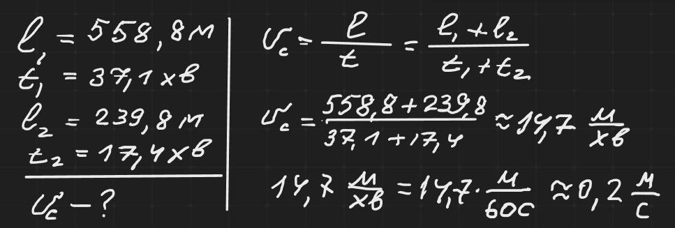 Ідучи вранці до школи, назар пройшов 558,8 м шляху за 37,1 хв, а потім ще 239,8 м за 17,4 хв. Знайди середню швидкість, з якою Назар ішов до школи у м/хв, а потім переведи цю швидкість у м/с. (Якщо потрібно результат округли до десятих).