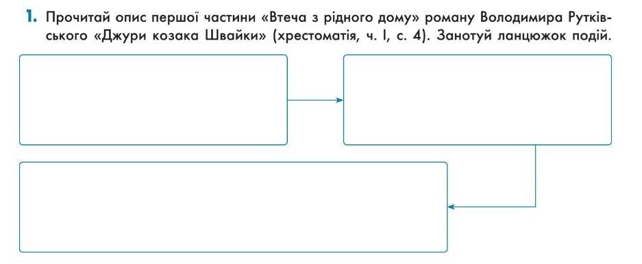 1. Прочитай опис першої частини «Втеча з рідного дому» роману Володимира Рутків- ського «Джури козака Швайки» (хрестоматія, ч. 1, с. 4). Занотуй ланцюжок подій.