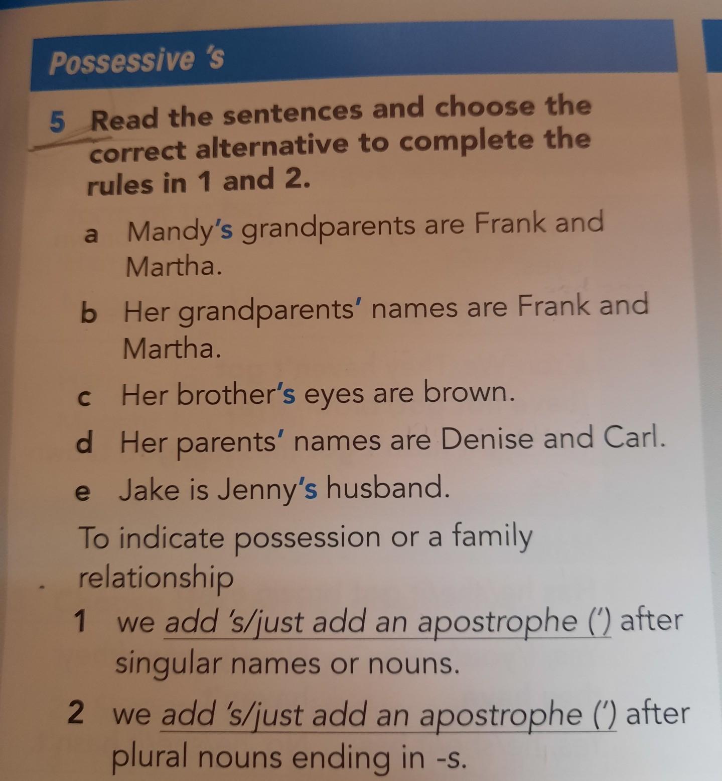 5 Read the sentences and choose the correct alternative to complete the rules in 1 and 2. a Mandy's grandparents are Frank and Martha. b Her grandparents' names are Frank and Martha. C Her brother's eyes are brown. d Her parents' names are Denise and Carl. e Jake is Jenny's husband. To indicate possession or a family relationship 1 we add 's/just add an apostrophe (') after singular names or nouns. 2 we add 's/just add an apostrophe (') after plural nouns ending in -s.
