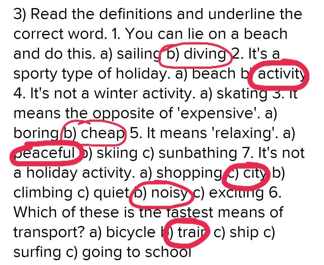 3) Read the definitions and underline the correct word. 1. You can lie on a beach and do this. a) sailing b) diving 2. It's a sporty type of holiday. a) beach b) activity 4. It's not a winter activity. a) skating 3. It means the opposite of 'expensive'. a) boring b) cheap 5. It means 'relaxing'. a) peaceful b) skiing c) sunbathing 7. It's not a holiday activity. a) shopping c) city b) climbing c) quiet b) noisy c) exciting 6. Which of these is the fastest means of transport? a) bicycle b) train c) ship c) surfing c) going to school