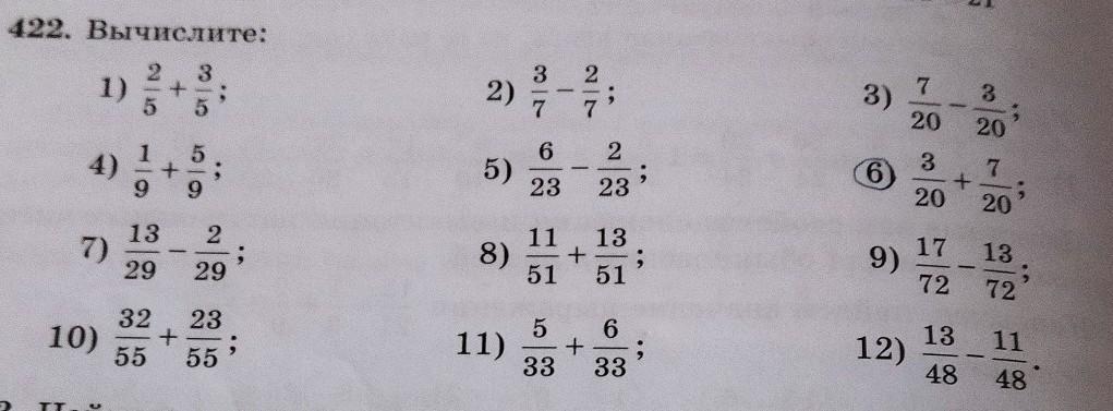 Вычислите: 1)2/5+3/5 2)3/7-2/7 3)7/20-3/20 4)1/9+5/1 5)6/23-2/23 6)3/20+7/20 7)13/29-2/29 8)11/51+13/51 9)17/72-13/72 10)32/55-23/55 11)5/33+6/33 12)13/48-11/47 Ответ в фото Срочно пжж