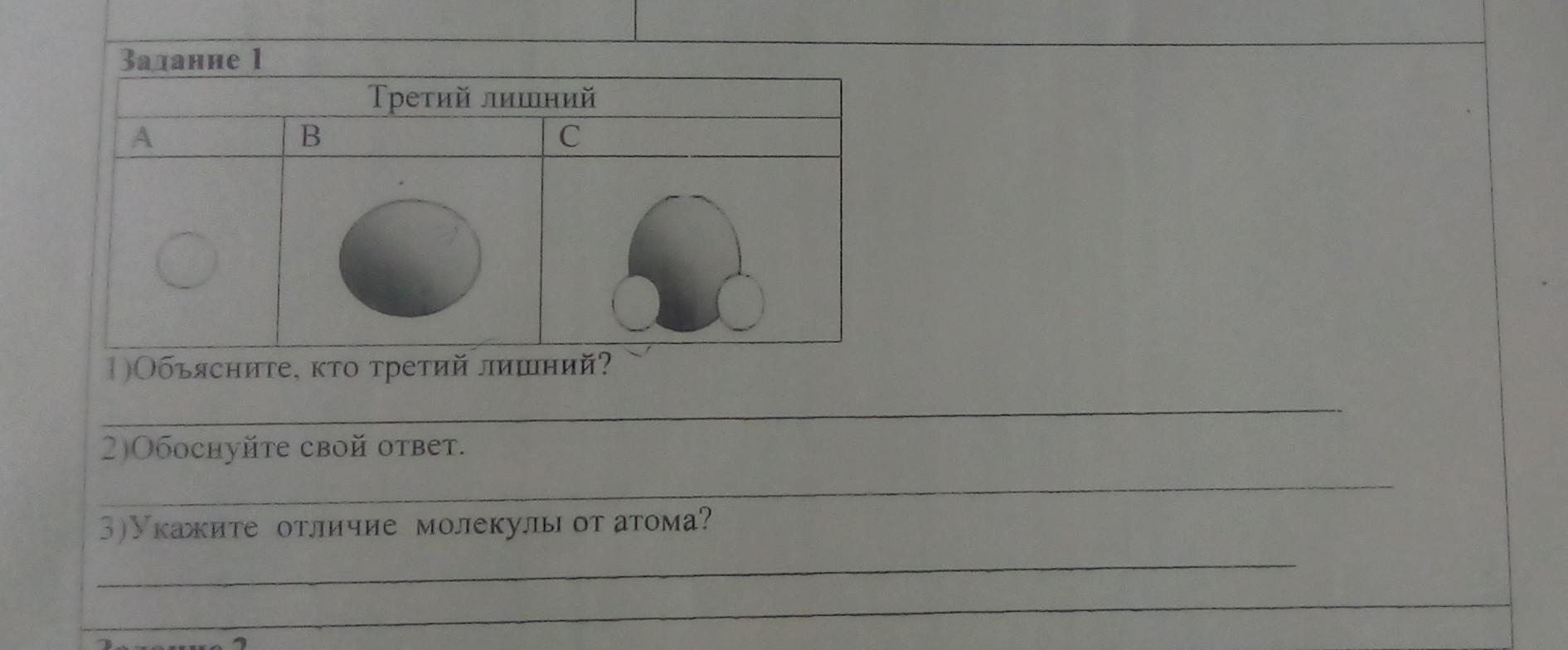 Задание 1 А В Задание 2 Третий лишний с 1)Объясните, кто третий лишний? 2)Обоснуйте свой ответ. 3)Укажите отличие молекулы от атома?