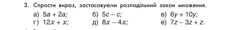 3. Спрости вираз, застосовуючи розподільний закон множення. a) 5a +2a; в) 6у + 10у; e) 7z - 3z +Z. г) 12х + x; б) 5с-с; д) 8x - 4x;