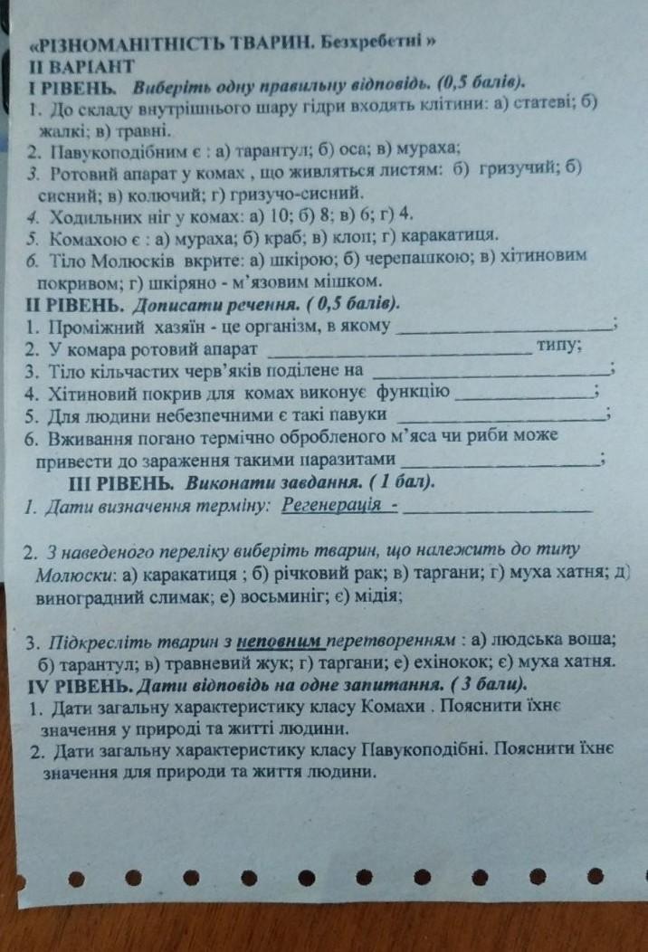 «РІЗНОМАНІТНІСТЬ ТВАРИН. Безхребетні II ВАРІАНТ IРIВЕНЬ. Виберіть одну правильну відповідь. (0,5 балів). 1. До складу внутрішнього шару гiдри входять клітини: а) статеві; б) жалкi; в) травні. 2. Павукоподібним є: а) тарантул; б) оса; в) мураха; 3. Ротовий апарат у комах, що живляться листям: б) гризучий; б) сисний; в) колючий; г) гризучо-сисний. 4. Ходильних ніг у комах: а) 10; 6) 8; в) 6; г) 4. 5. Комахою є: а) мураха; б) краб; в) клоп; г) каракатиця. 6. Тіло Молюсків вкрите: а) шкірою; б) черепашкою; в) хiтиновим покривом; г) шкіряно-м'язовим мішком. II РІВЕНЬ. Дописати речення. (0,5 балів). 1. Проміжний хазяїн - це організм, в якому 2. У комара ротовий апарат 3. Тіло кільчастих черв'якiв подiлене на 4. Хітиновий покрив для комах виконує функцію 5. Для людини небезпечними є такі павуки 6. Вживання погано термічно обробленого м'яса чи риби може привести до зараження такими паразитами III РIВЕНЬ. Виконати завдання. (1 бал). 1. Дати визначення терміну: Регенерація - типу: 2. З наведеного переліку виберіть тварин, що належить до типу Молюски: а) каракатиця; б) річковий рак; в) таргани; г) муха хатня; д) виноградний слимак; е) восьминіг; є) мідія; 3. Підкресліть тварин з неповним перетворенням : а) людська воша; б) тарантул; в) травневий жук; г) таргани; е) ехінокок; є) муха хатня. IV PIВЕНЬ. Дати відповідь на одне запитання. (3 бали). 1. Дати загальну характеристику класу Комахи. Пояснити їхнє значення у природi та житті людини. 2. Дати загальну характеристику класу Павукоподібні. Пояснити їхнє значення для природи та життя людини.