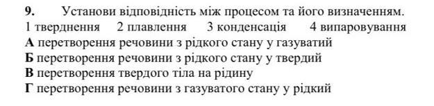 9. Установи відповiднiсть мiж процесом та його визначенням. 4 випаровування 2 плавлення 3 конденсація 1 тверднення А перетворення Б перетворення речовини з рідкого стану у газуватий речовини з рідкого стану у твердий В перетворення твердого тіла на рідину Г перетворення речовини з газуватого стану у рідкий