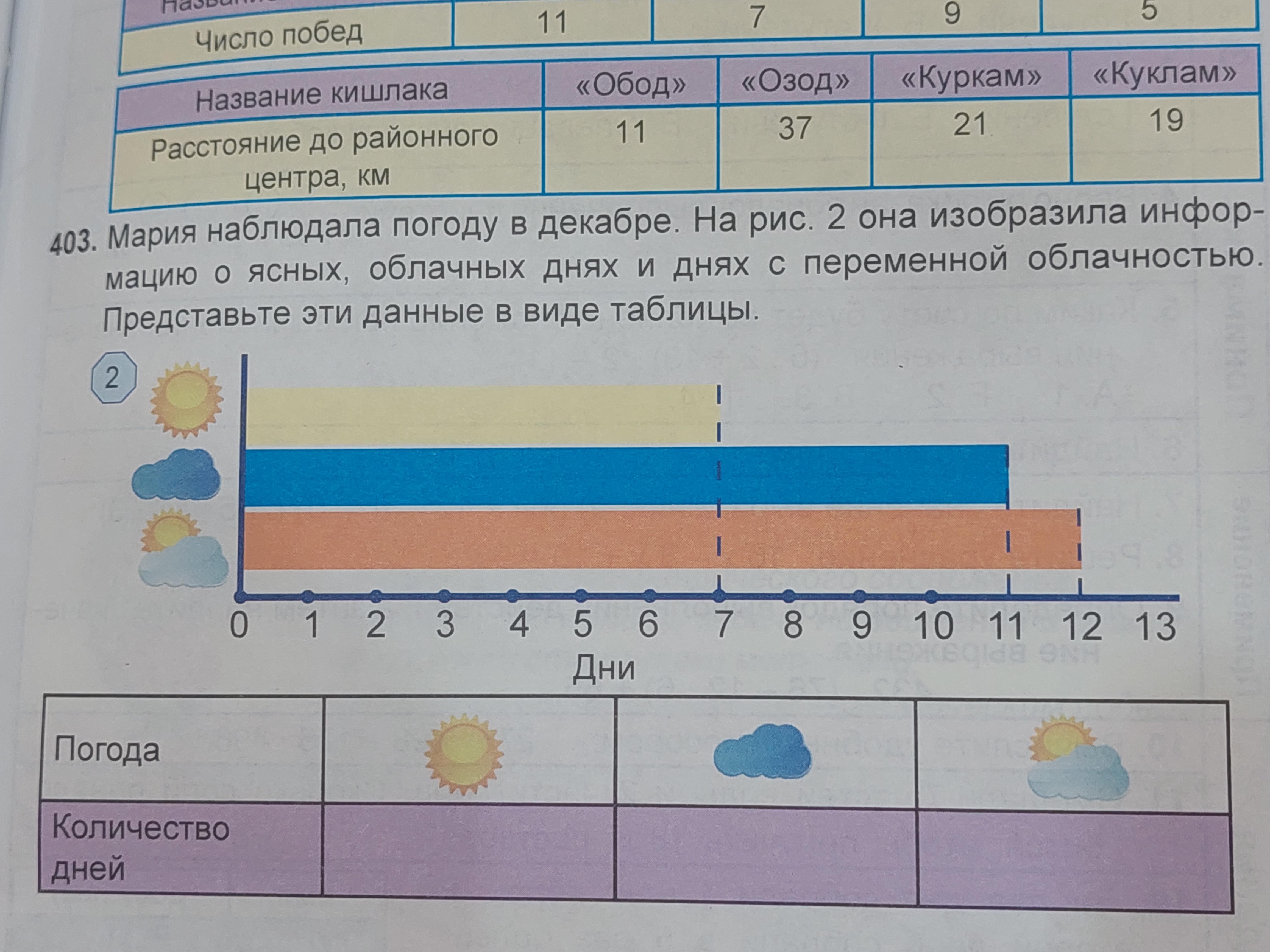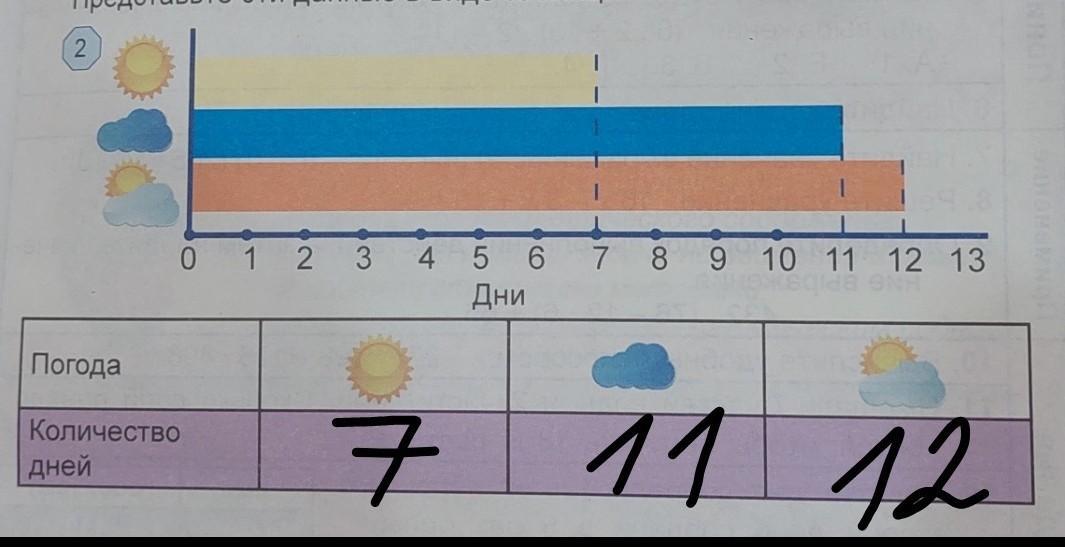 Мария наблюдала погоду в декабре. На рис .2она изобразила информация о ясных,облачных днях и днях с переменное облачностью. Представьте эти данные в виде таблицы