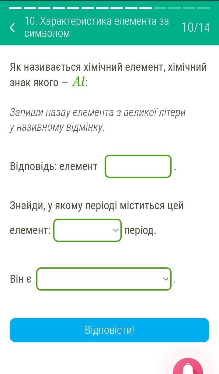 Запиши назву хімічного елемента, який має символ Al: