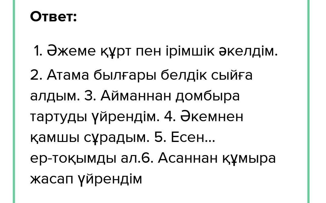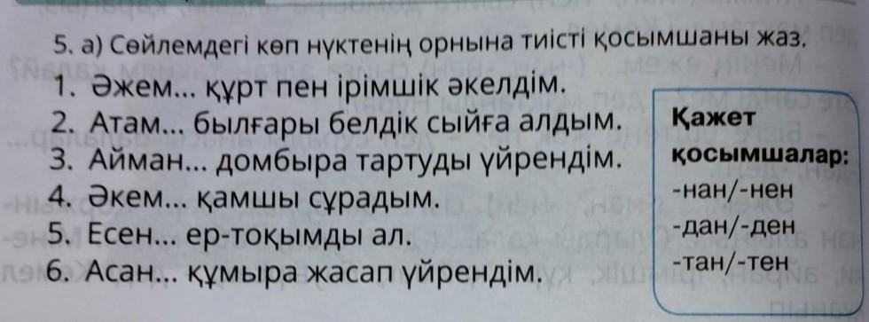 5. а) Сөйлемдегi кеп нүктенің орнына тиісті қосымшаны жаз. 1. Әжем... құрт пен ірімшік әкелдім. 2. Атам... былғары белдік сыйға алдым. 3. Айман... Домбыра тартуды үйрендім. 4. Әкем... Қамшы сұрадым. 5. Есен... ер-тоқымды ал. 6. Асан... құмыра жасап үйрендім. Қажет косымшалар: -нан/-нен -дан/-ден -тан/-тен