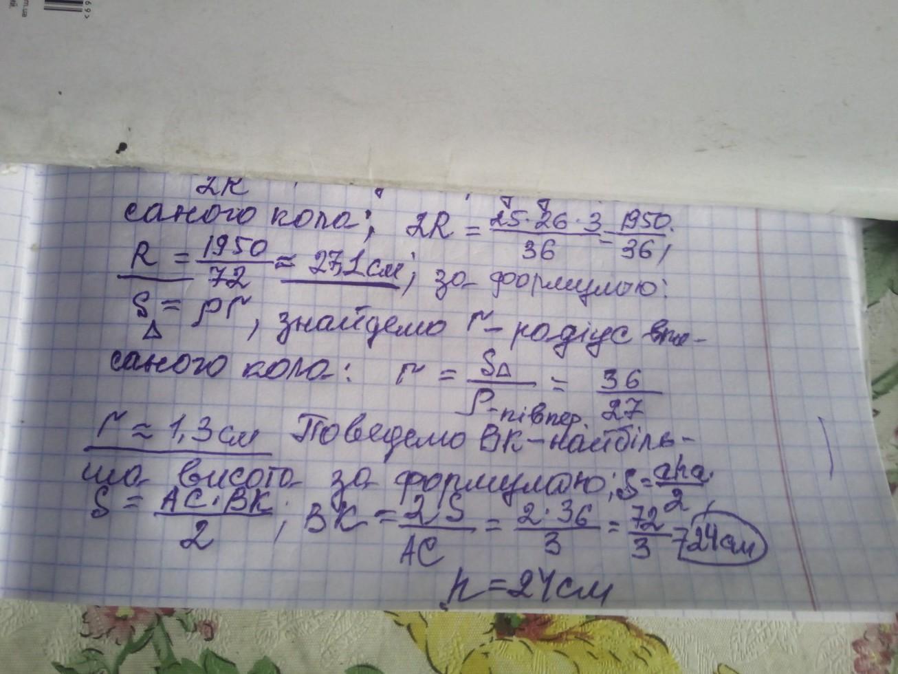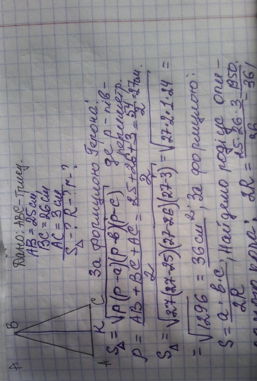 Знайдіть площу трикутника, сторони якого дорівнюють 3см, 25 см і 26см. Чому дорівнює радіус вписаного та описаного навколо цього трикутника кола? Знайдіть найбільшу висоту цього трикутника.