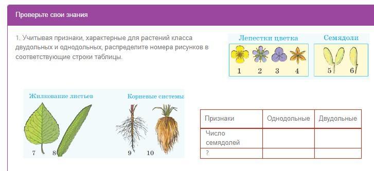 Двудольные - две семядоли, количество лепестков кратно 4 или 5, стержневая корневая система, жилкование сетчатое.