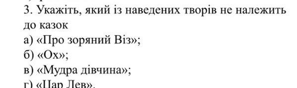 3. Укажіть, який із наведених творів не належить до казок а) «Про зоряний Віз»; б) «Ox»; в) «Мудра дівчина»; г) «Цар Лев».