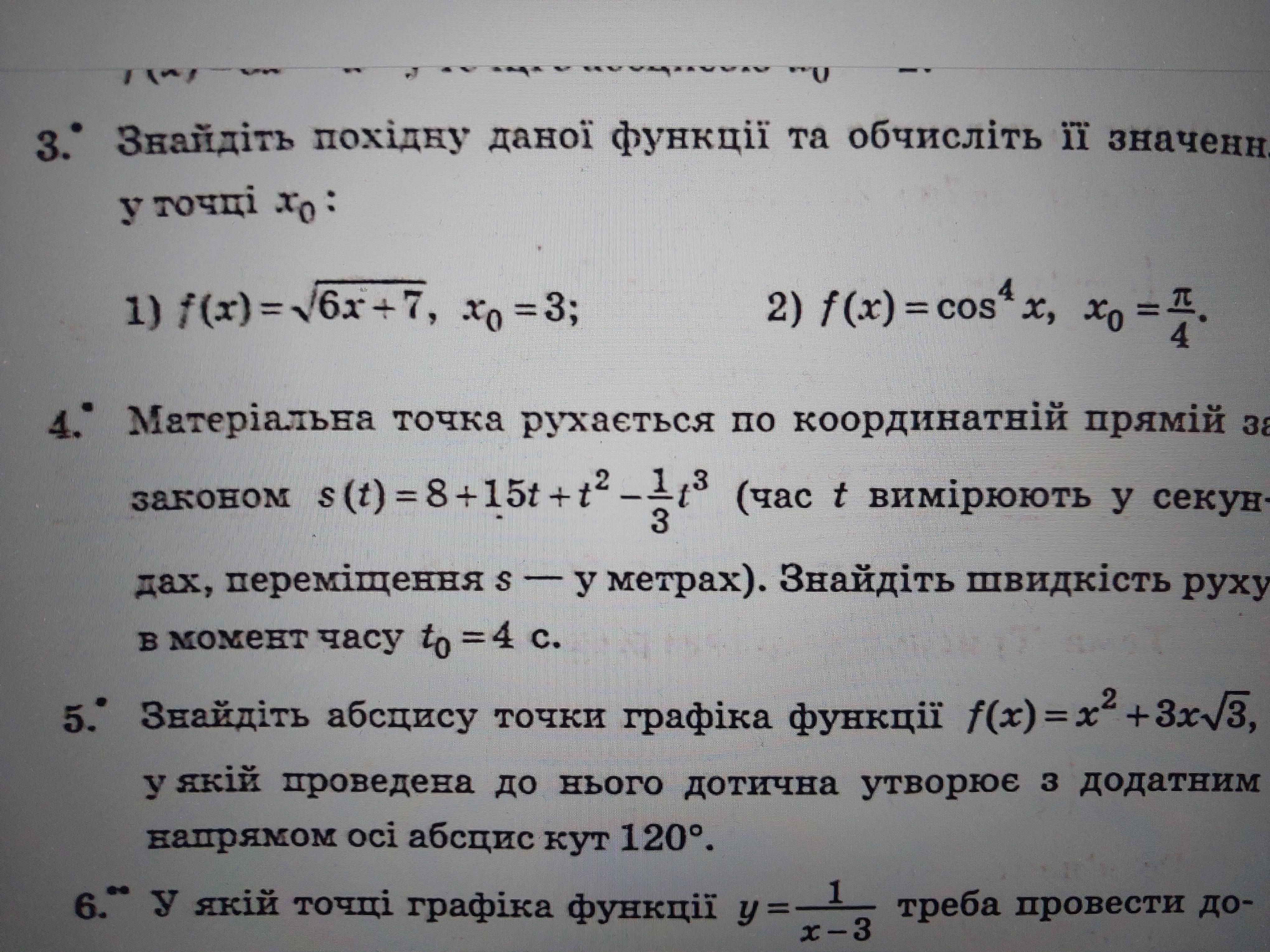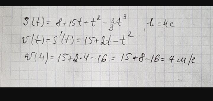 Матеріальна точка рухається по координатній прямій за законом s(t)=8+15t+t²-1/3t³( час t вимірюється у секундах переміщення s в метрах) знайдіть швидкість руху в момент часу t0=4 c