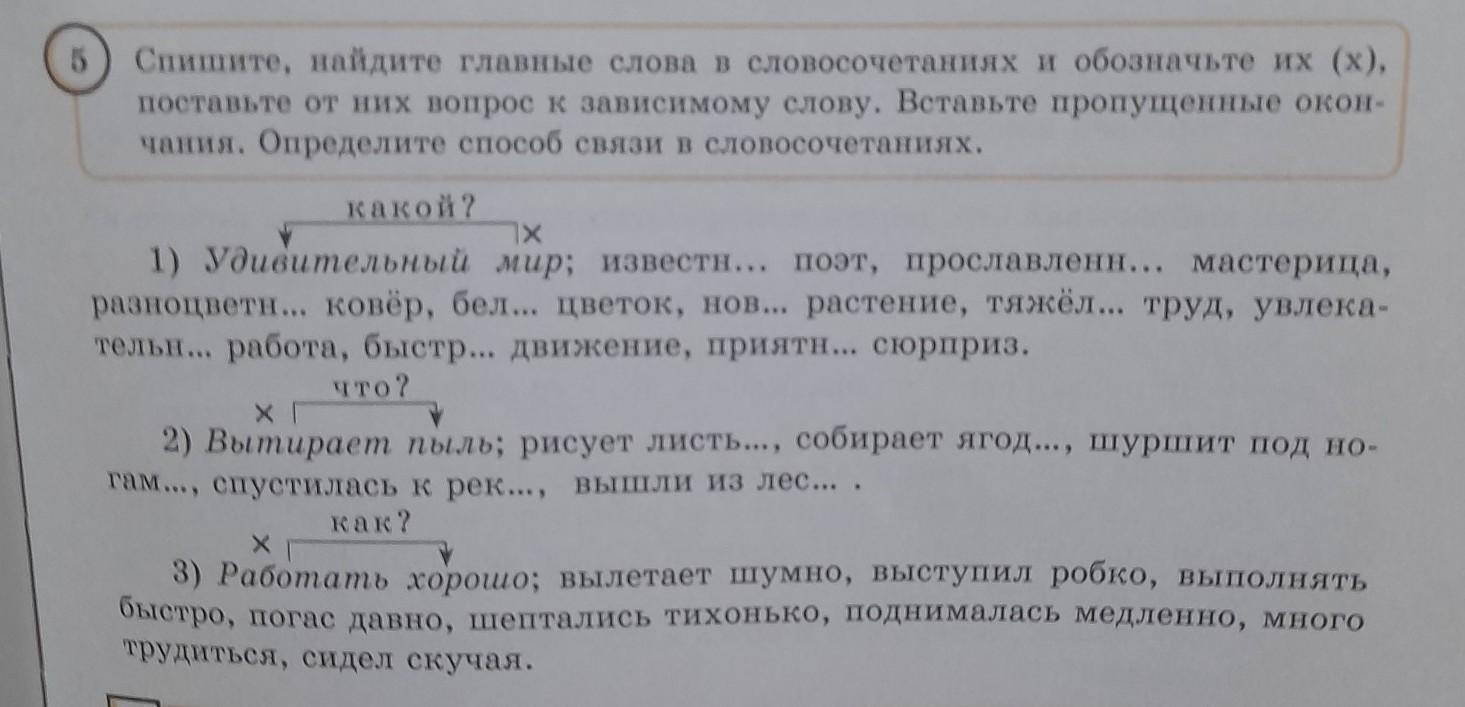 5 Спишите, найдите главные слова в словосочетаниях и обозначьте их (х), поставьте от них вопрос к зависимому слову. Вставьте пропущенные окон- чания. Определите способ связи в словосочетаниях.