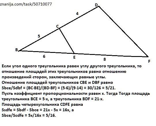 Sbce/Sdbf = (BC·BE)/(BD·BF) = (5·6)/(9·14) = 30/126 = 5/21.