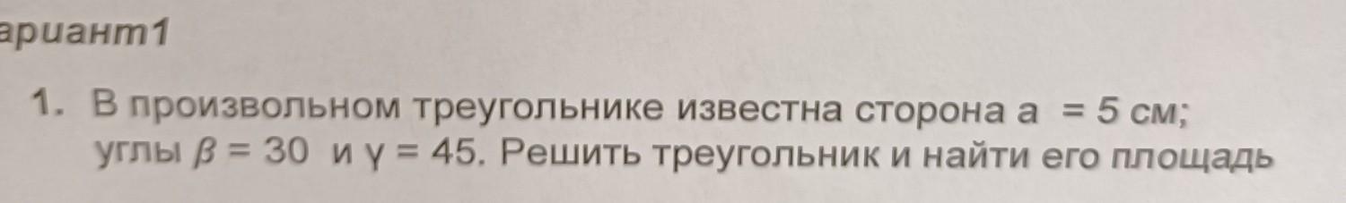 Вариант1 1. В произвольном треугольнике известна сторона а = 5 см; углы в = 30 и у = 45. Решить треугольник и найти его площадь