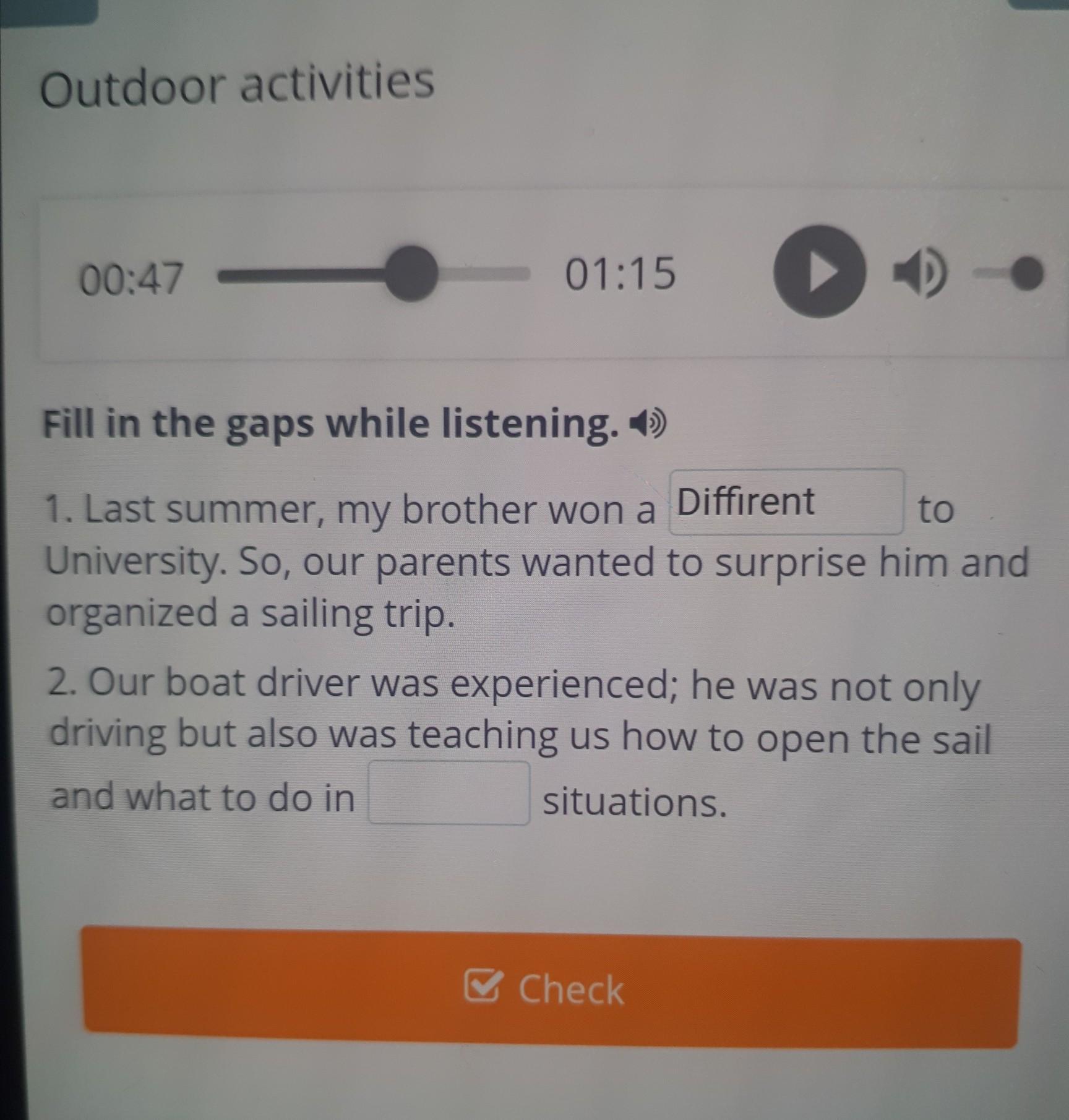 Fill in the gaps while listening. to 1. Last summer, my brother won a Diffirent University. So, our parents wanted to surprise him and organized a sailing trip. 2. Our boat driver was experienced; he was not only driving but also was teaching us how to open the sail and what to do in situations.