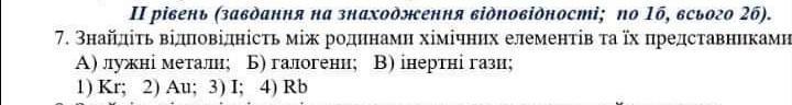 7. Знайдіть вiдповiднiсть мiж родинами хiмiчних елементів та їх представниками А) лужнi метали; Б) галогени; в) інертні гази; 1) Kr; 2) Au; 3)1; 4) Rb СРОЧНО СРОЧНО СРОЧНО СРОЧНО СРОЧНО