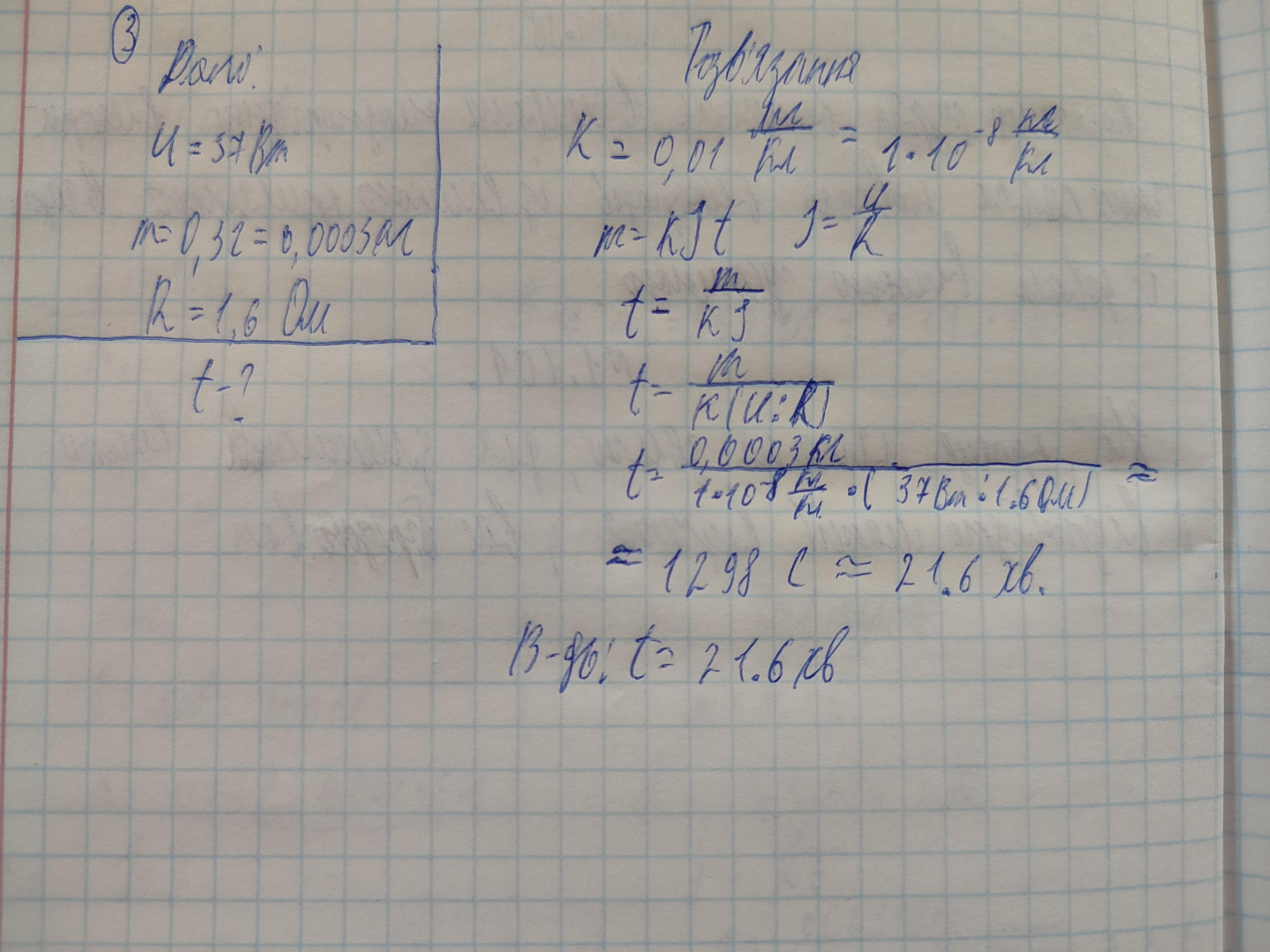Електроліз сульфатної кислоти відбуваеться за потужності струму 37в. За який час на електроді виділиться 0.3 г водню, якщо опір електроліту дорівнює 1,6 ОМ?