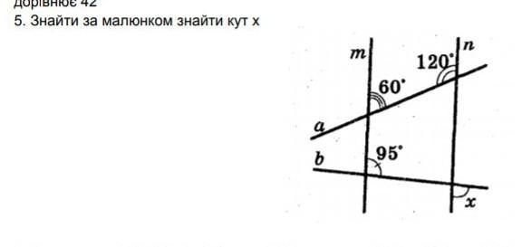 60+120=180 внутрішні односторонні, тоді m||n. відповідні кути рівні. Сума суміжних кутів дорівнює 180°; х=180-95=