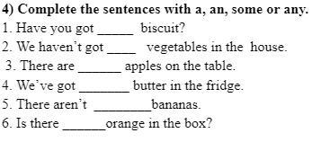 Ответ: 1 a 2 any 3 some 4 some/a 5 any 6 some