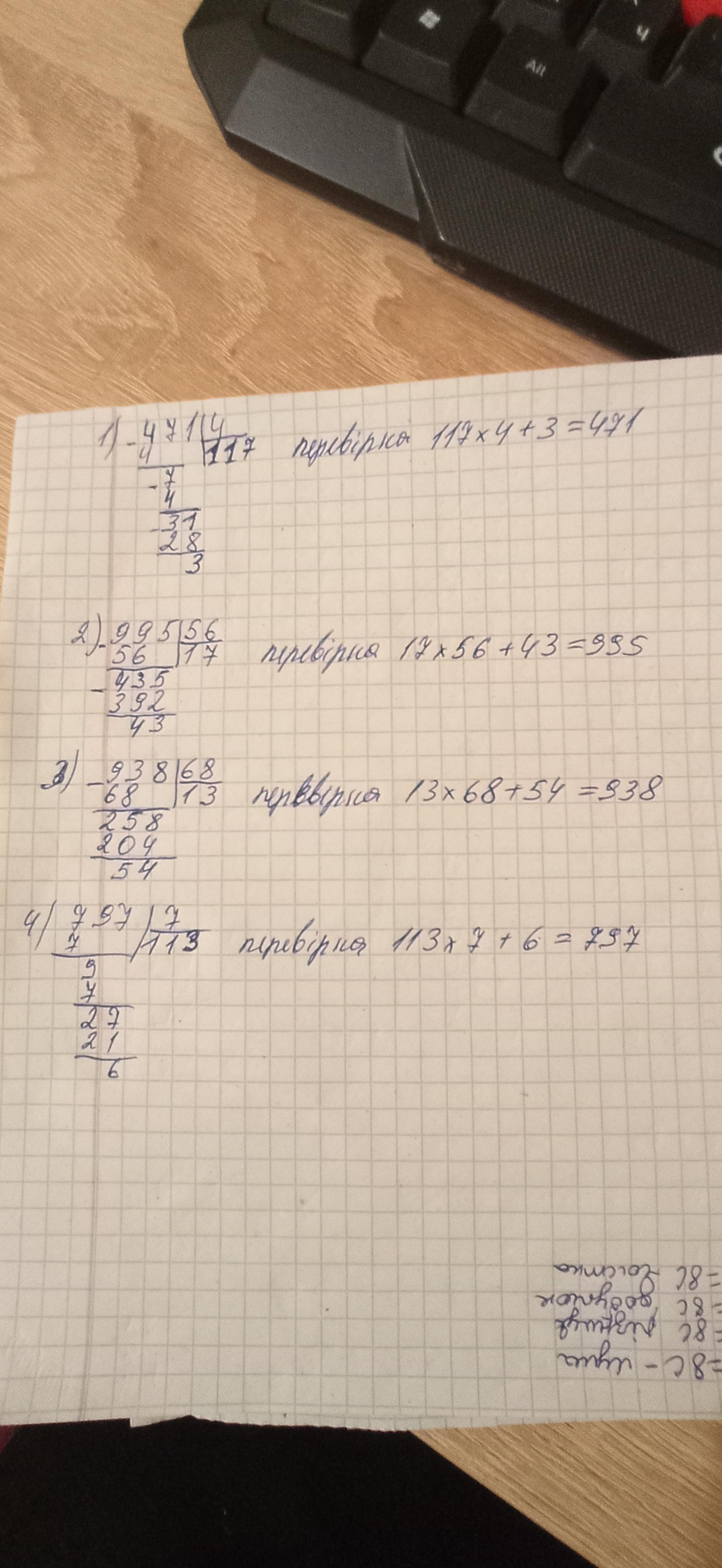 Приклади у стовпчик з перевіркою 471:4 995:56 938:68 797:7 срочно Даю 15 балів дуже срочно!!!!!!!!