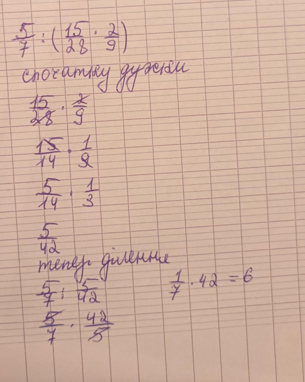5/7:(15/28•2/9) = 15/28 • 2/9 = 5/14 • 1/3 = 5/42 5/7 : 5/42 = 5/7 • 42/5 = 1/1 • 6/1 = 6/1 = 6