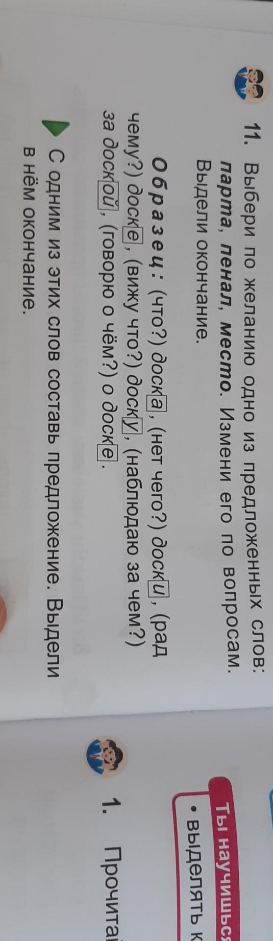11. Выбери по желанию одно из предложенных слов: парта, пенал, место. Измени его по вопросам. Выдели окончание. Образец: (что?) доска, (нет чего?) доски, (рад чему?) доске, (вижу что?) доску, (наблюдаю за чем?) за доской], (говорю о чём?) о доске.