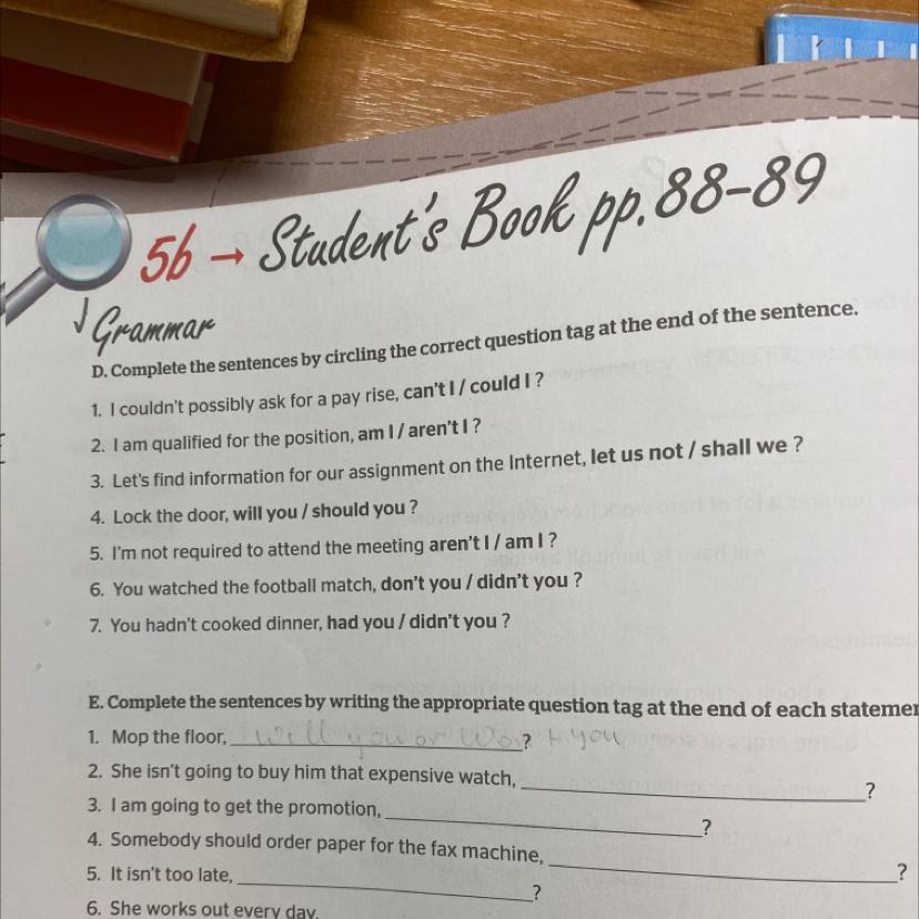 1could I 2 am I 3 shall we 4will you 5 am I 6 didn’t you 7had you