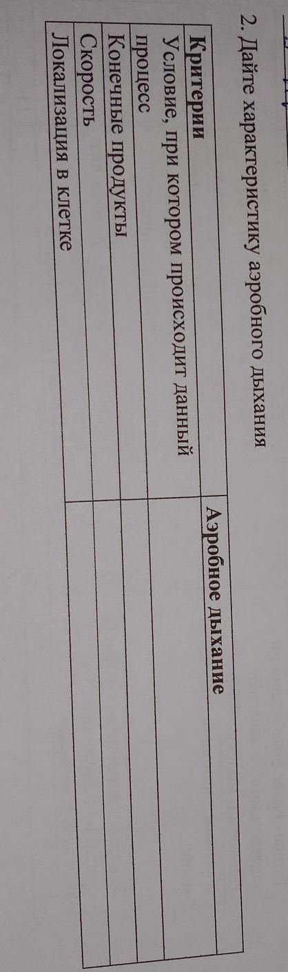Дайте характеристику аэробного дыхания Аэробное дыхание Условие, при котором происходит данный процесс Критерии Конечные продукты Локализация в клетке срочно помогите!!