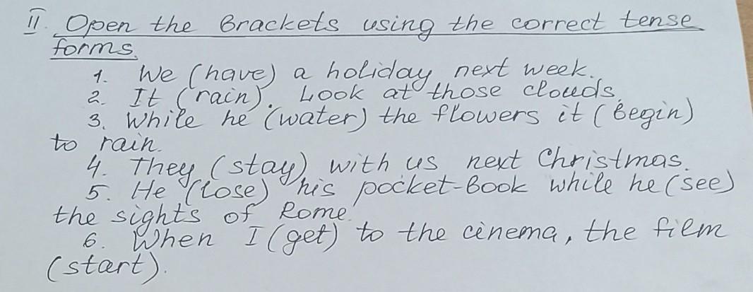 1.Having;2.raining;3.watering/begin;4)staying;5)loose/saw;6)get/starts