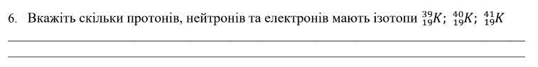 39K: 19 електронів; 19 протонів; (39-19=20) 20 нейтронів;