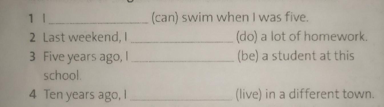 2 Last weekend, I 3 Five years ago, I school. 4 Ten years ago, I 51 61 7 Last night, I 8 When I was six, I (can) swim when I was five. (do) a lot of homework. (be) a student at this (live) in a different town. (make) my own breakfast this morning. (choose) the clothes I'm wearing now. (go) out with my friends. (study) English.